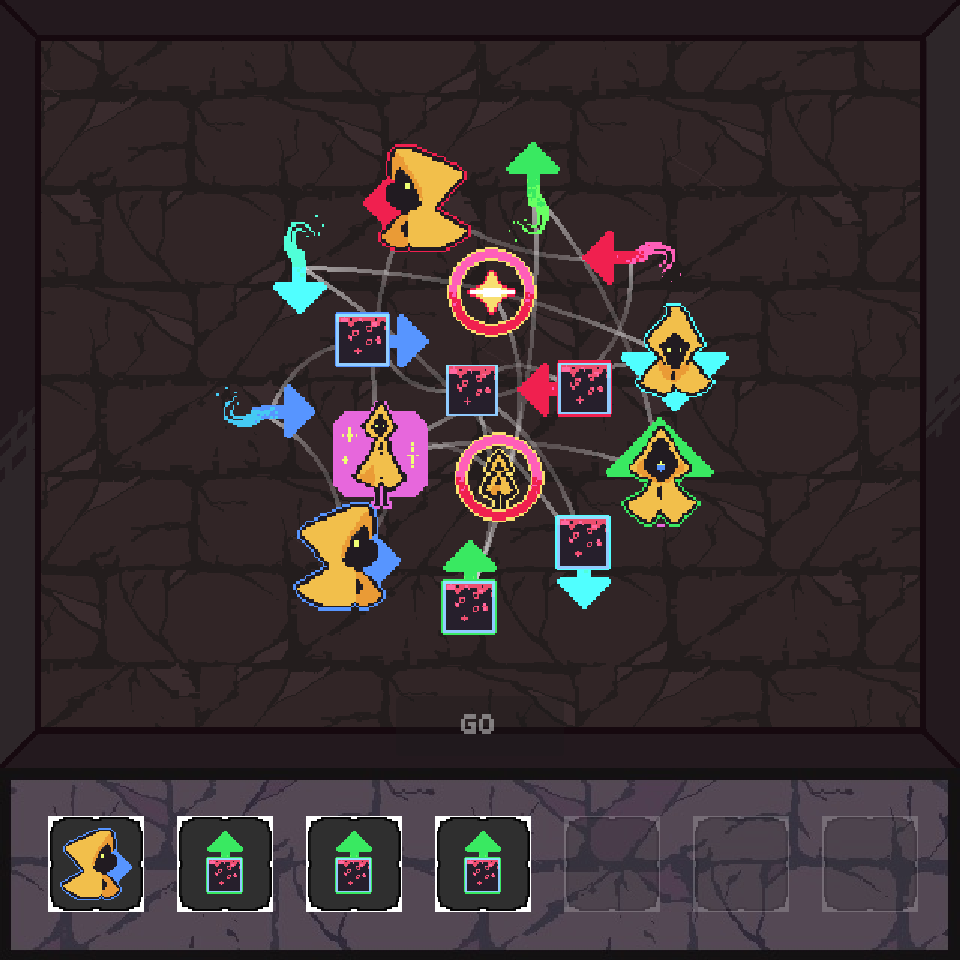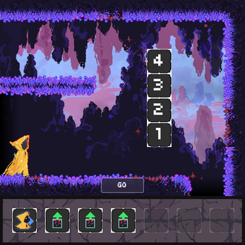 You don't move directly — instead, you build a sequence of actions and hit GO. Collect movement components scattered across the world, craft them together into usable actions, queue them up, and watch your plan unfold. If something goes wrong, you reset and try again.